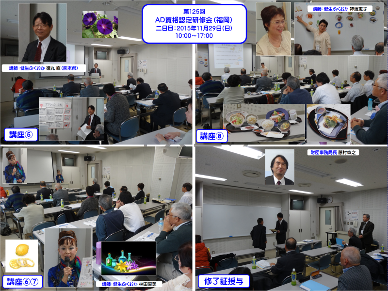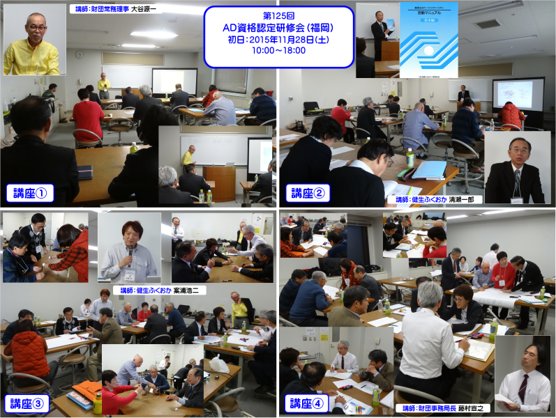 右の写真は、昨年のAD養成講座のスナップです。健生ふくおかのアットホームな教室を利用して、財団提供のシラバスに基づき、講師の皆さんそれぞれ個性あふれる素晴らしい講義をされていました。