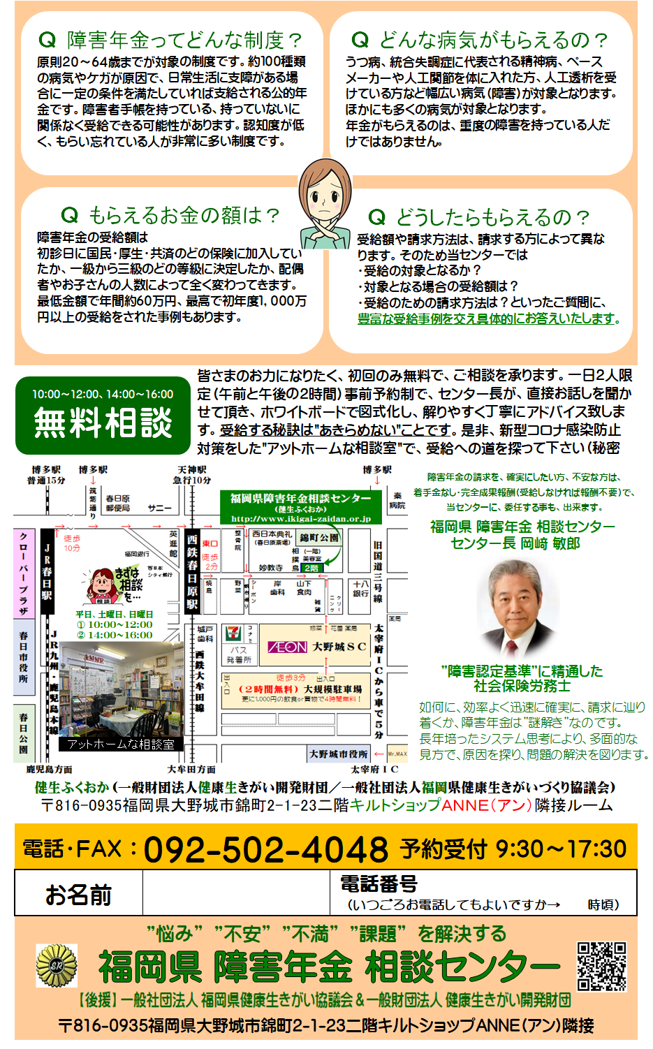 福岡県障害年金相談センター 障害年金受給支援〜障害者就労支援 運営:社会保険労務士Office ANNE(アン) 岡崎敏郎